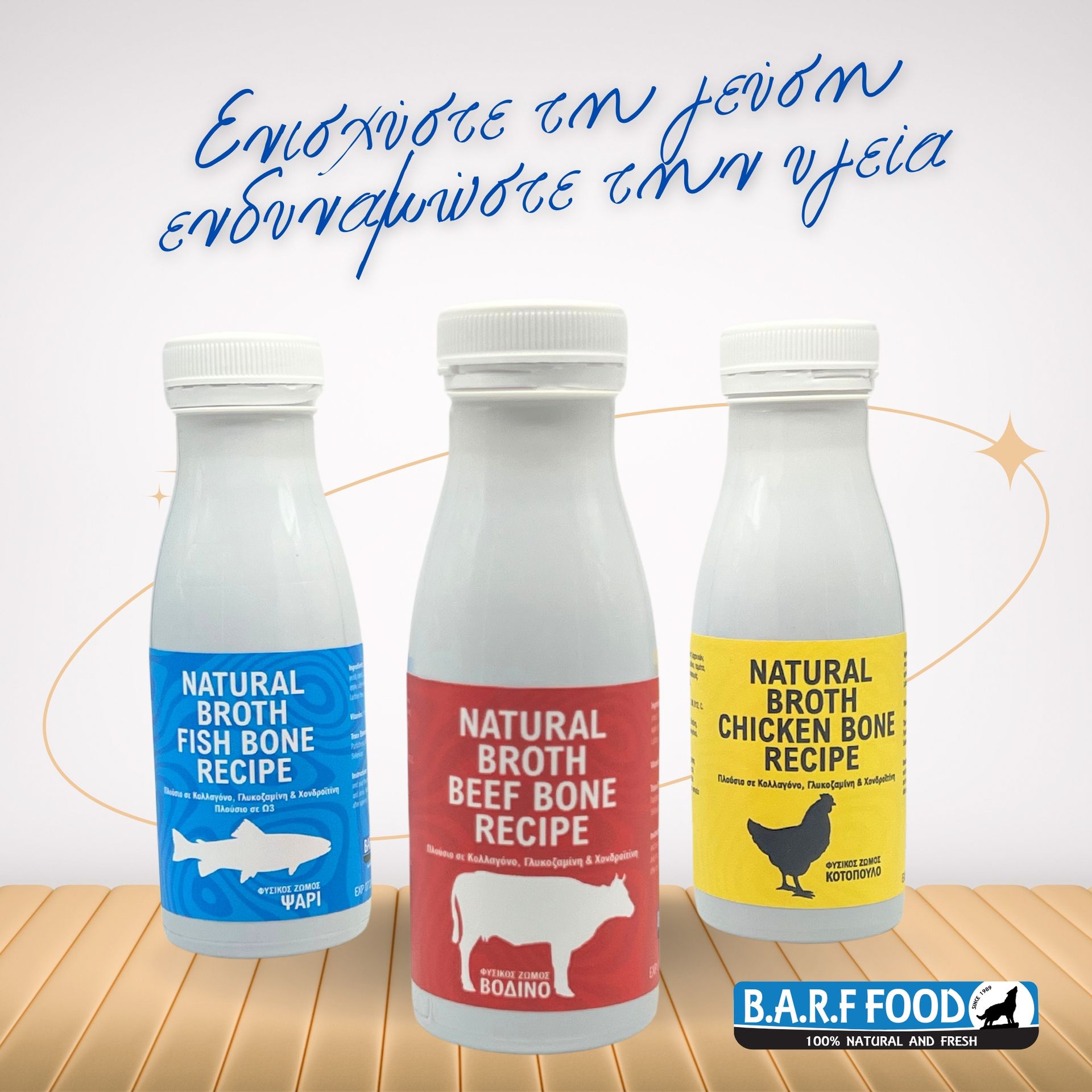 Οι φυσικοί ζωμοί της BarfFood είναι μια προσεκτικά σχεδιασμένη σειρά συμπληρωμάτων διατροφής, εμπλουτισμένη με πολύτιμα θρεπτικά συστατικά. Παρασκευασμένοι από επιλεγμένα συστατικά όπως φρέσκα ψάρια και λαχανικά (καρότο, σπανάκι, σέλινο, ντομάτα), και ενισχυμένοι με ένα πλήρες σύμπλεγμα βιταμινών (A, D3, E, K3, B1, B2, B6, B12, C) και ιχνοστοιχείων. Χωρίς λακτόζη και πρόσθετα MSG, οι ζωμοί μας αποτελούν την ιδανική επιλογή για την ενίσχυση της καθημερινής διατροφής του κατοικιδίου σας, προσφέροντας επιπλέον γεύση και θρεπτική αξία σε κάθε γεύμα. Η υψηλή περιεκτικότητα σε πρωτεΐνη (7.5%) και η προσθήκη φυσικών βοτάνων όπως ρίγανη και κουρκουμάς, εγγυώνται την ανώτερη ποιότητα και γεύση που αξίζει το κατοικίδιό σας.
